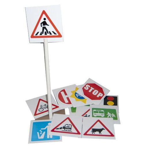 Age 3+ A cardboard road sign set (12pc & 2 Pole & 2 stands) can be used to teach children about road safety. Easy to set up.